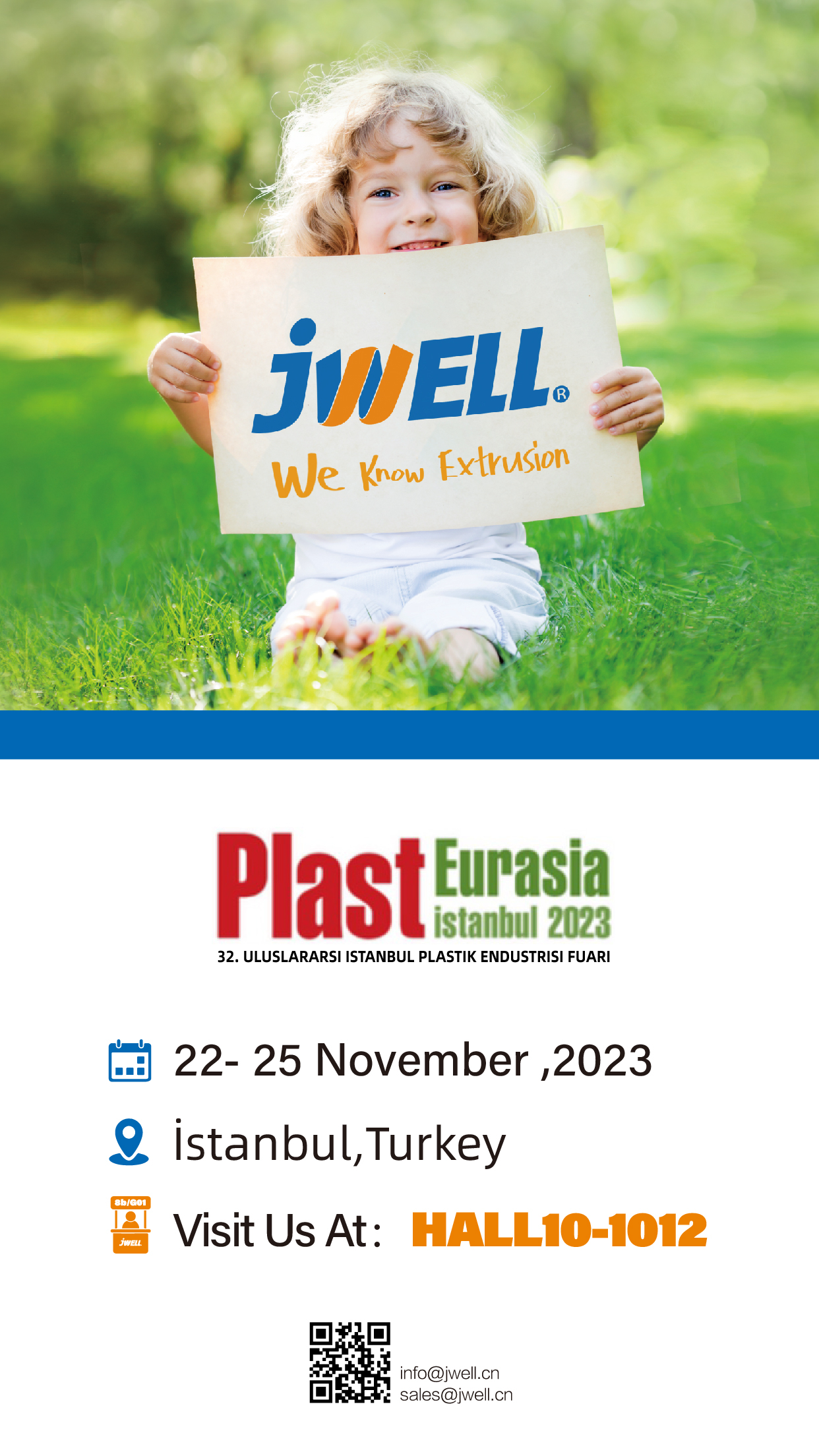 will be grandly opened at the Istanbul International Exhibition Center in Turkey from November 22th–25th,2023. Our booth number:HALL10-1012,JWELL Machinery participates as scheduled and makes a wonderful appearance with the overall solution of intelligent and innovative plastic extrusion technology. Our booth number: HALL10-1012.Very welcome new and old customers from all over the world to consult and negotiate.